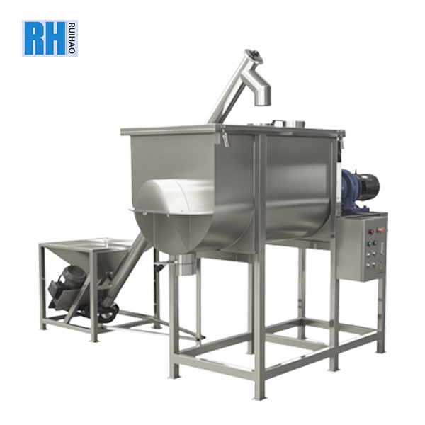 This horizontal food powder mixer is constructed from food-grade stainless steel and features a built-in feeding hopper and a dual-motor drive system. It is engineered for rapid, homogeneous blending of dry food powders and fine granules, such as seasoning mixes, flour, nutritional powders, and beverage bases. The design ensures hygienic operation, easy cleaning, and reliable performance, making it an efficient solution for modern food processing and powder productionlines.